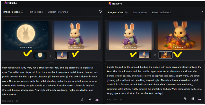 하나로 이어지는 영상을 만들기 위해서 프롬프트로 조정해야 하는 건가 싶었는데 하일루오를 살펴보니 첫 프레임과 마지막 프레임 이미지를 첨부할 수 있는 부분이 있었다. 이것을 통해서 이어질 수 있도록 할 수 있을 것 같았다. 이번 영상 생성도 프롬프트 없이 생성시켜 봤는데 역시 프롬프트 없이는 원하는 의도로 생성되지 않았다. 원하는 의도가 있을 때는 프롬프트를 넣어주고 디렉션을 해주는 것이 바른 방법이라는 것을 다시 한 번 더 깨달았다.